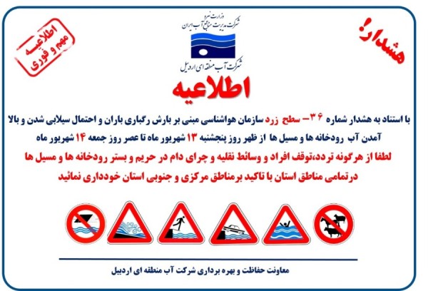 معاونت حفاظت و بهره برداری شرکت آب منطقه ای اردبیل با صدور اطلاعیه ای اعلام کرد: با استناد به هشدار شماره 36 - سطح زرد هواشناسی کشور مبنی بر رگبار باران توام با رعد و برق در ظهر روز پنج شنبه مورخ سیزدهم شهریور ماه لغایت عصر روز جمعه چهاردهم شهریورماه و بدلیل احتمال سیلابی شدن رودخانه ها و مسیل ها از هرگونه تردد و توقف افراد و وسائط نقلیه و چرای دام در حریم و بستر رودخانه های تمامی مناطق استان علی الخصوص در مناطق مرکزی و جنوبی استان اردبیل خودداری نمایند.
