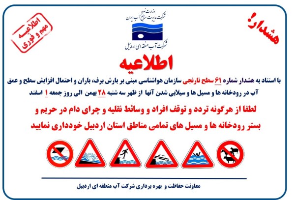 معاونت حفاظت و بهره برداری شرکت آب منطقه ای اردبیل با صدور اطلاعیه ای اعلام کرد: با استناد به هشدار شماره 61 - سطح نارنجی هواشناسی کشور مبنی بر بارش برف و باران در روز سه شنبه مورخ بیست و هشتم بهمن ماه لغایت روز جمعه یکم اسفند ماه و بدلیل احتمال سیلابی شدن رودخانه ها و مسیل ها از هرگونه تردد و توقف افراد و وسائط نقلیه و چرای دام در حریم و بستر رودخانه های در تمامی مناطق استان اردبیل خودداری نمایند.