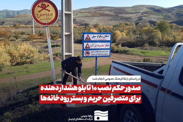 به گزارش روابط عمومی شرکت آب منطقهای اردبیل، با پیگیریهای انجام شده این تابلوها تهیه و بر روی منابع آبی نصب شد.