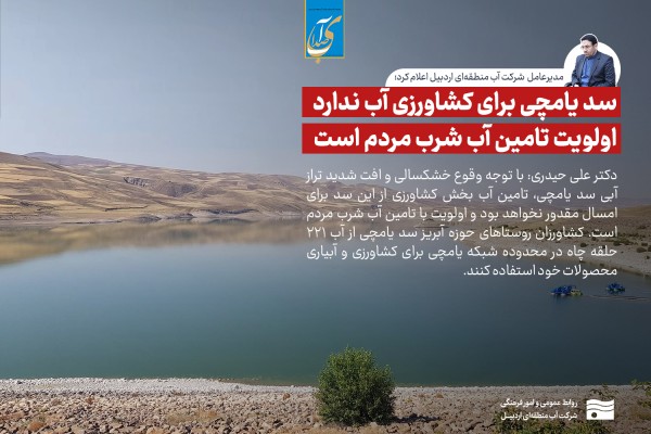 رئیس هیئت مدیره و مدیرعامل شرکت آب منطقهای اردبیل اعلام کرد: با توجه وقوع خشکسالی و افت شدید تراز آبی سد یامچی، تامین آب بخش کشاورزی از این سد برای امسال مقدور نخواهد بود و اولویت با تامین آب شرب مردم است.