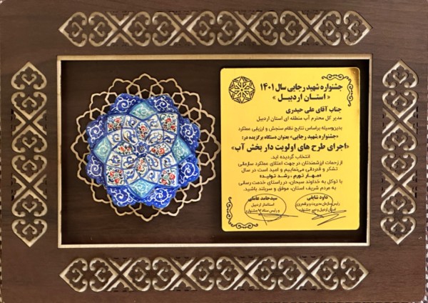 در لوحی که به همین منظور با امضای استاندار اردبیل و رئیس ستاد جشنواره شهید رجایی استان صادر شده، خطاب به دکتر علی حیدری اناری، مدیرعامل شرکت آب منطقه ای اردبیل آمده است: «به همت و تلاش مجموعه کارکنان و مدیران آن دستگاه و بر اساس نتایج نظام سنجش و ارزیابی عملکرد در جشنواره شهید رجایی سال 1401 عنوان دستگاه برگزیده جشنواره شهید رجایی در اجرای طرح های اولویت دار بخش آب را احراز نموده اید.