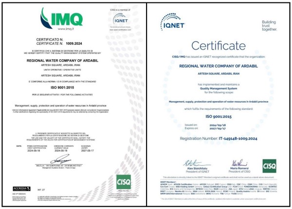 عضو هیئت مدیره و معاون برنامه ریزی شرکت آب منطقه ای اردبیل گفت: این شرکت با انجام اقدامات لازم در راستای استقرار سیستم مدیریت کیفیت موفق به دریافت گواهینامه ISO9001:2015 شد.