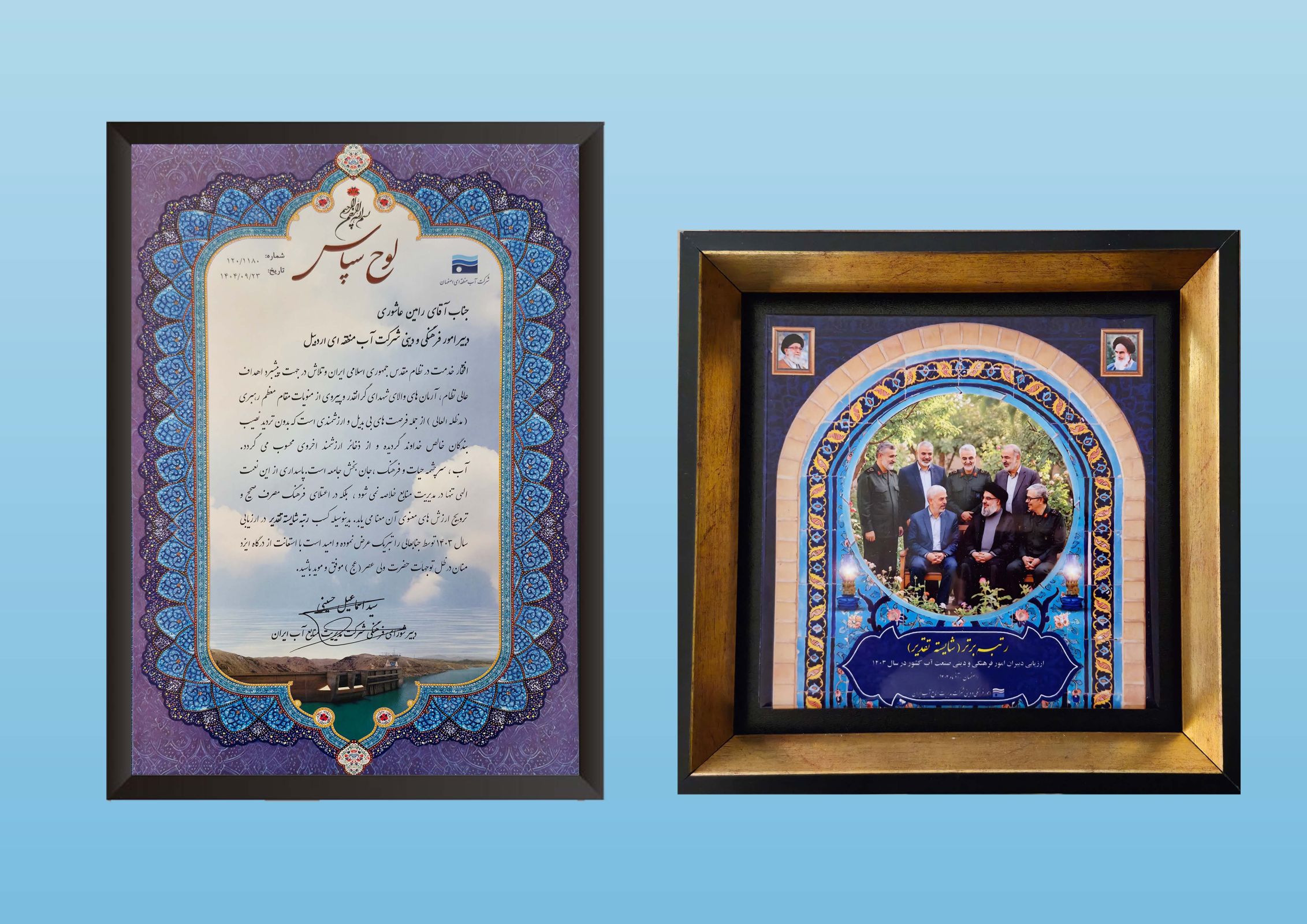 در لوح سپاسی که به همین منظور با امضای حجت الاسلام سیداسماعیل حسینی، دبیر شورای فرهنگی شرکت مدیریت منابع آب ایران خطاب به رامین عاشوری، مدیر روابط عمومی و امور فرهنگی شرکت آب منطقه ای اردبیل صادر شده، آمده است: «افتخار خدمت در نظام مقدس جمهوری اسلامی ایران و تلاش در جهت پیشبرد اهداف عالی نظام، آرمان های والای شهدای گرانقدر و پیروی از منویات مقام معظم رهبری (مدظله العالی) از جمله فرصت های بی بدیل و ارزشمندی است که بدون تردید نصیب بندگان خالص خداوند گردیده و از ذخائر ارزشمند اخروی محسوب می گردد. آب، سرچشمه حیات و فرهنگ، جان بخش جامعه است. پاسداری از این نعمت الهی تنها در مدیریت منابع خلاصه نمی شود، بلکه در اعتلای فرهنگ مصرف صحیح و ترویج ارزش های معنوی آن معنا می یابد. بدینوسیله کسب رتبه شایسته تقدیر ویژه در ارزیابی سال 1403 توسط جنابعالی را تبریک عرض نموده و امید است با استعانت از درگاه ایزد منان در ظل توجهات حضرت ولی عصر (عج) موفق و موید باشید.»