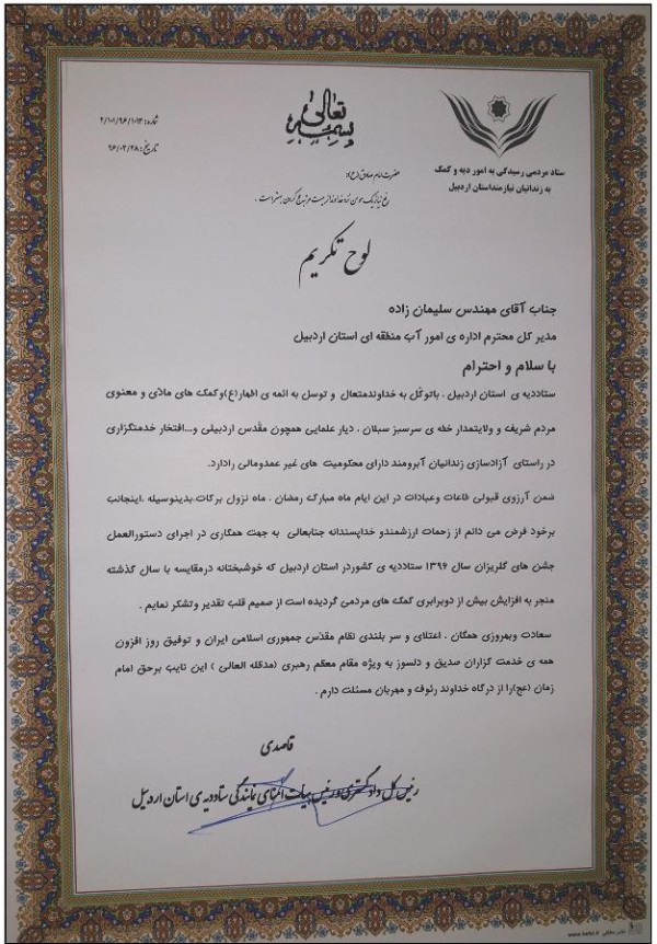 به گزارش اداره روابط عمومی شرکت آب منطقه ای اردبیل، در بخشی از متن این لوح آمده است:«ضمن آرزوی قبولی طاعات و عبادات در این ایام ماه مبارک رمضان، ماه نزول برکات، بدینوسیله اینجانب برخود فرض می دانم از زحمات ارزشمند و خداپسندانه جنابعالی به جهت همکاری در اجرای دستورالعمل جشن های گلریزان سال 96 ستاد دیه کشور در استان اردبیل که خوشبختانه در مقایسه با سال گذشته منجر به افزایش بیش از دو برابری کمک های مردمی گردیده است از صمیم قلب تقدیر و تشکر نمایم.»