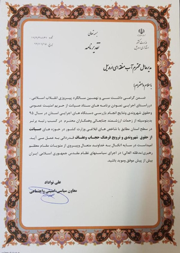 در متن این لوح که به امضای معاون سیاسی و امنیتی استاندار اردبیل رسیده است، آمده است: «ضمن گرامیداشت سی و نهمین سالگرد پیروزی انقلاب اسلامی، در راستای اجرایی نمودن برنامه های ستاد صیانت از حریم امنیت عمومی و حقوق شهروندی و نتایج انجام بازرسی دستگاههای اجرایی استان در سال 95 بدینوسیله از زحمات ارزشمند جنابعالی و همکاران محترم در کسب رتبه برتر در سطح استان مطابق با شاخص های ابلاغی وزارت کشور در حوزه های صیانت از حقوق شهروندی و ترویج فرهنگ حجاب و عفاف قدردانی بعمل می آید.