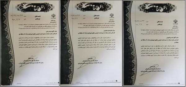 متن لوح تقدیر صادر شده به این شرح است: «نظر به کسب رتبه برتر در حوزه حریم امنیت عمومی و حقوق شهروندی توسط شرکت آب منطقه ای اردبیل طی ارزیابی های بعمل آمده و بررسی مستندات سال 96 و بازرسی در سال 97 برخود وظیفه می دانم از شما بعنوان کارشناس ستاد صیانت از حریم امنیت عمومی و حقوق شهروندی تقدیر و تشکر نمایم.»