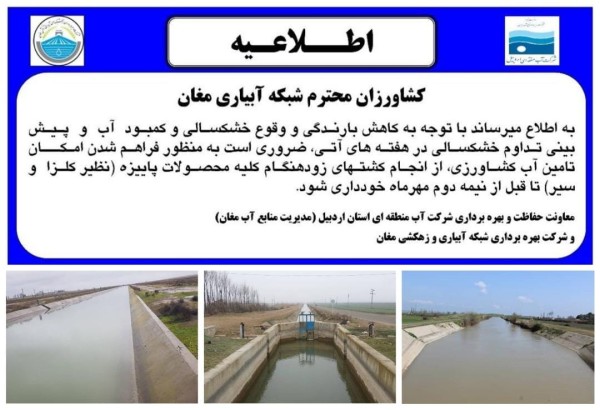 مهندس اصغر احمدنژاد مدیر منابع آب منطقه مغان نیز اظهار داشت: با توجه به اینکه به منظور خودداری از کشت زودرس پاییزه در شبکه آبیاری و زهکشی مغان، جلسات متعدد و اطلاع رسانی لازم با نصب بنر، گفتگو با کشاورزان، ارسال پیامک تلفنی به همه ذینفعان انجام شده است، بر این اساس ضرورت دارد کشاورزان تحت پوشش شبکه آبیاری و زهکشی مغان از کشت زودهنگام محصولات پاییزه خودداری نمایند.