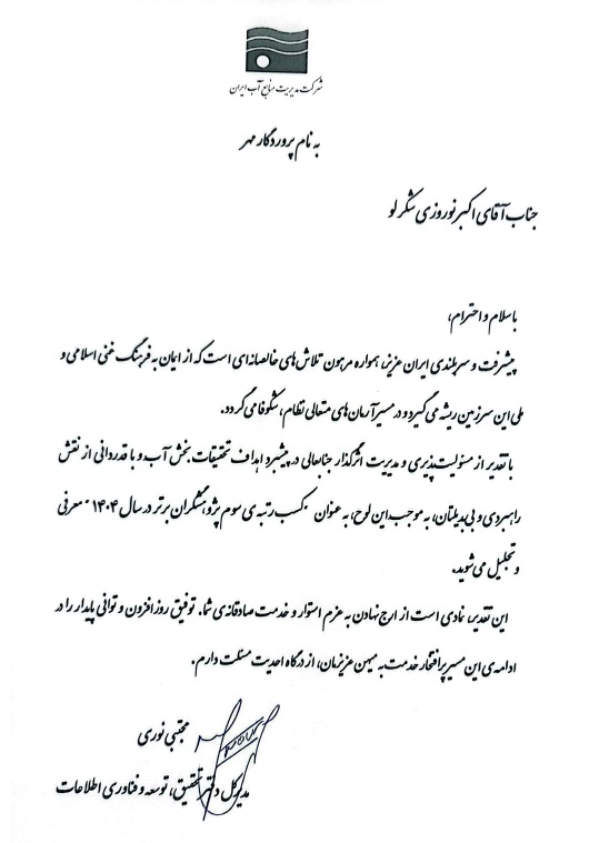 در لوحی که به همین مناسبت با امضای مجتبی نوری، مدیرکل دفتر تحقیق، توسعه و فناوری اطلاعات شرکت مدیریت منابع آب ایران خطاب به اکبر نوروزی شکرلو، کارشناس شرکت آب منطقه ای اردبیل صادر شده، آمده است: «با تقدیر از مسئولیت پذیری و مدیریت اثرگذار جنابعالی در پیشبرد اهداف تحقیقات بخش آب و با قدردانی از نقش راهبردی و بی بدیلتان، این لوح به عنوان کسب رتبه سوم پژوهشگران برتر در سال 1404 معرفی و تجلیل می شوید.»